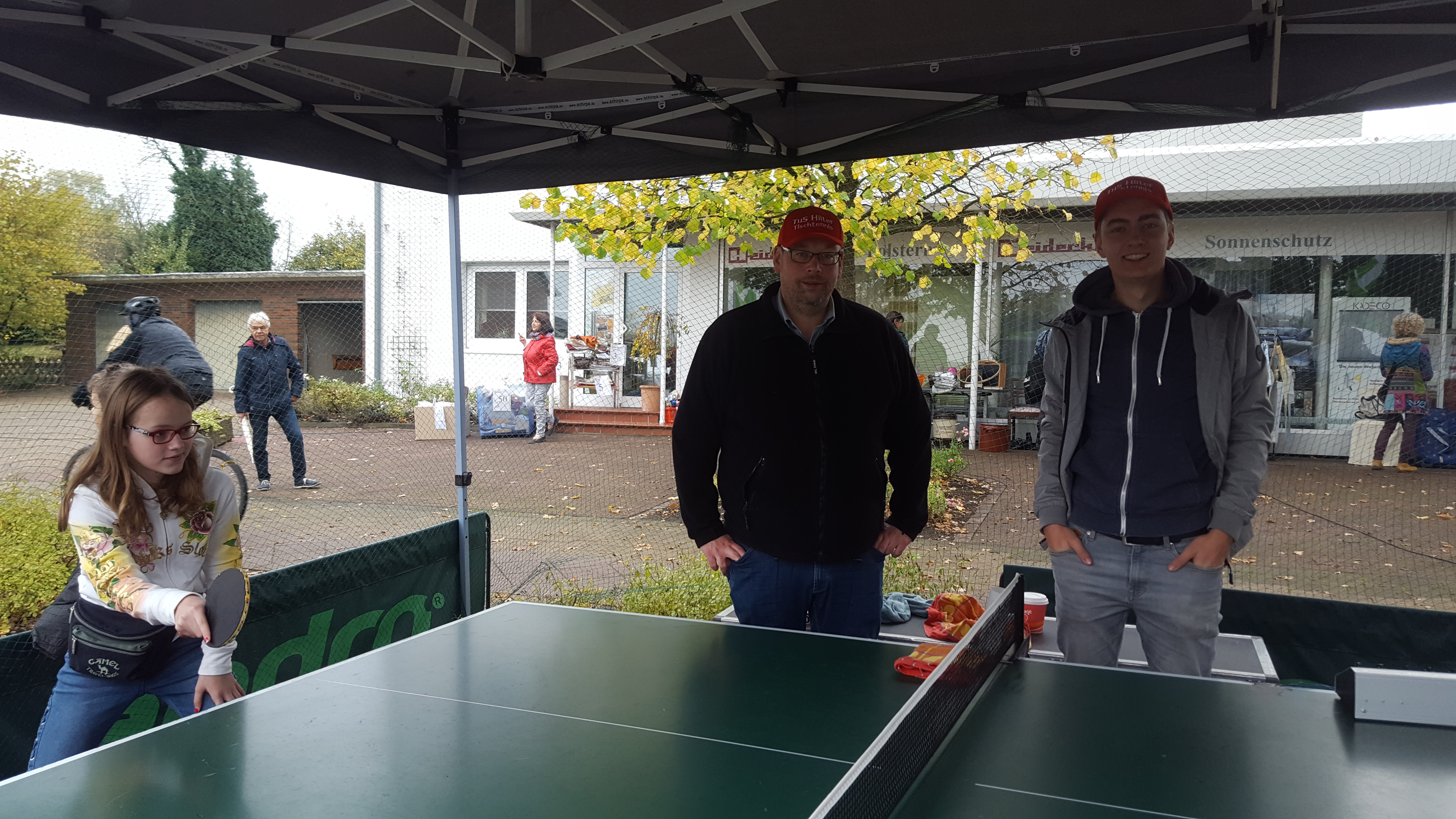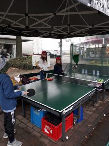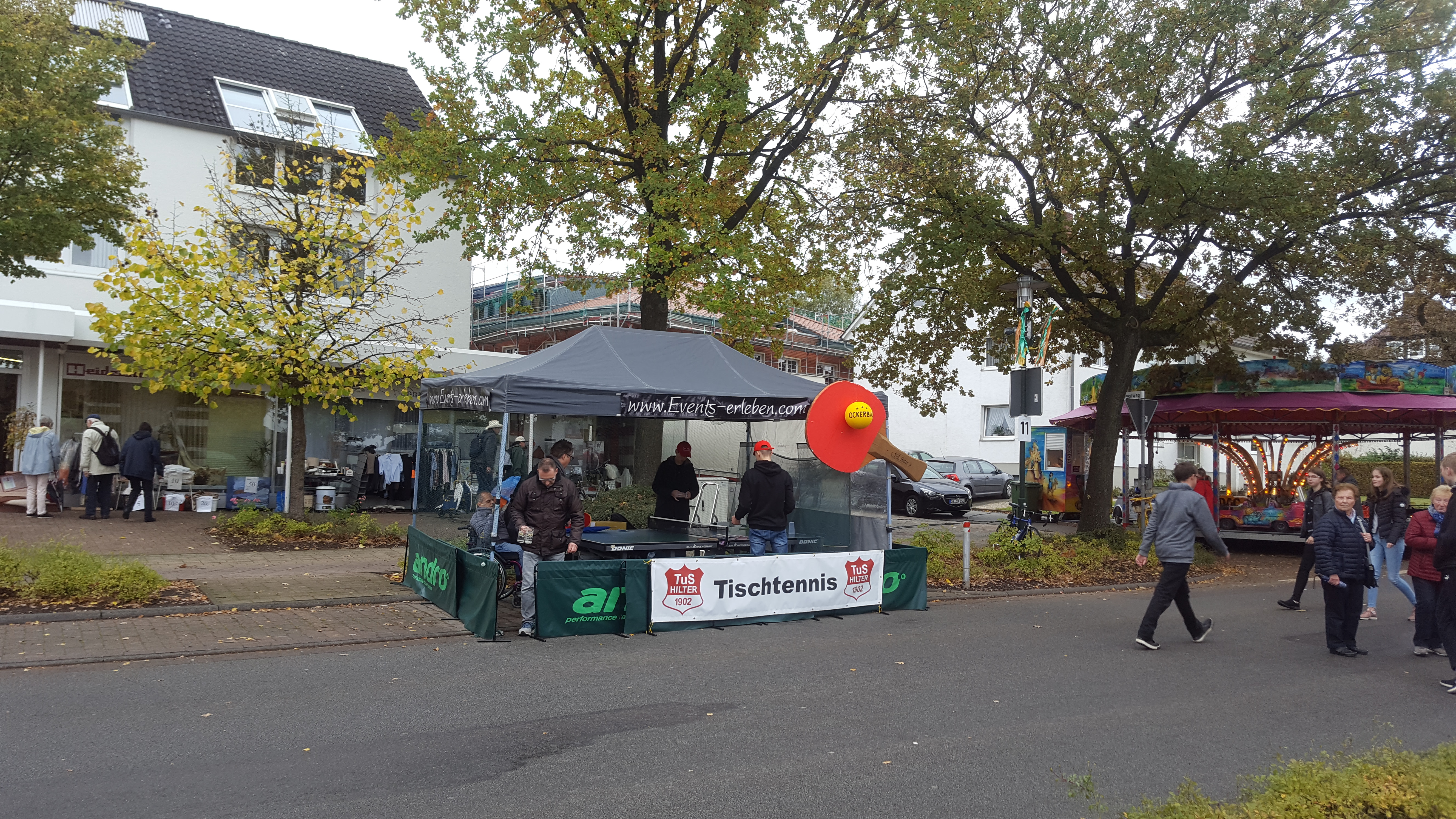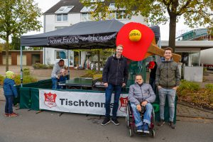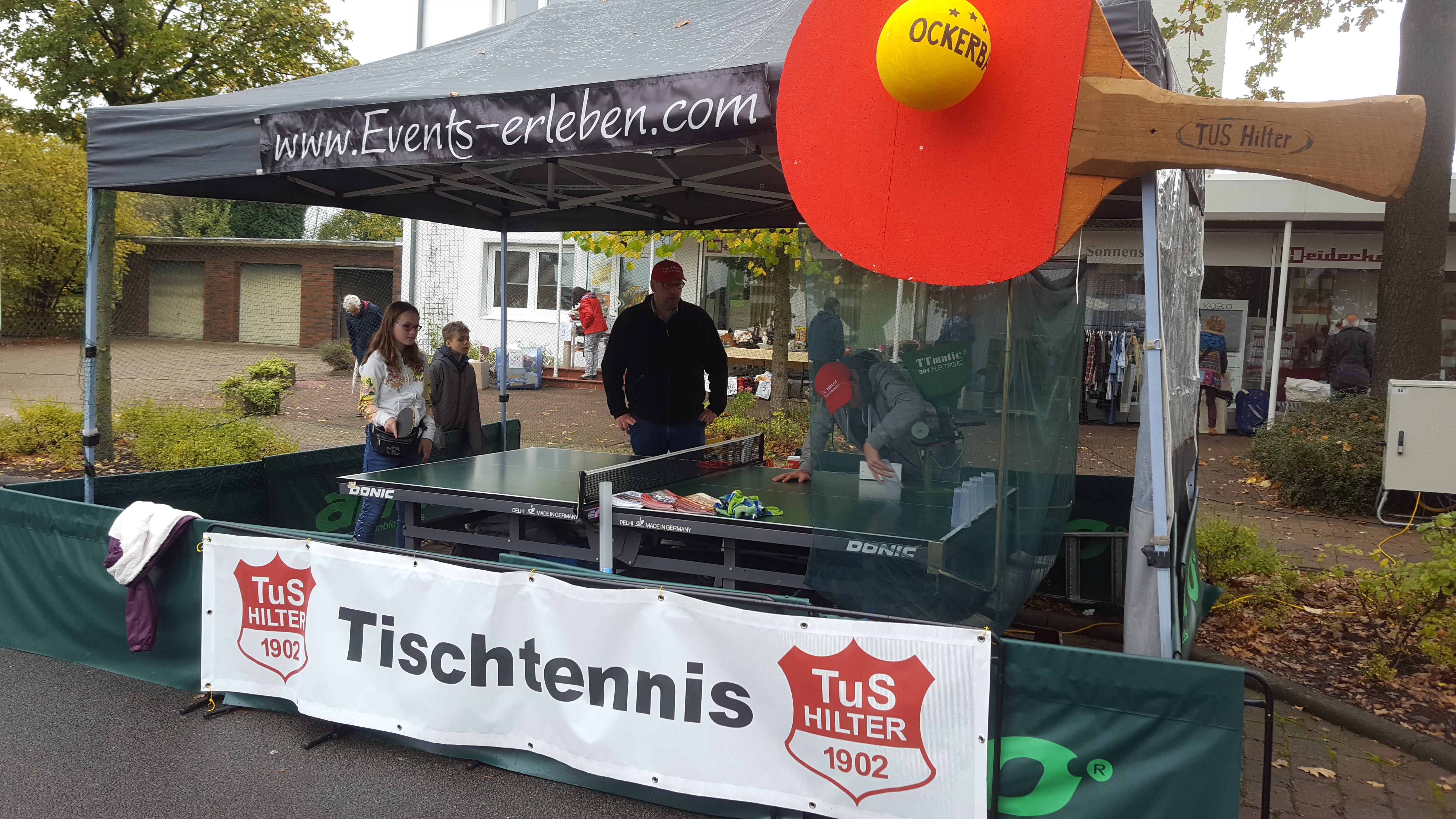 Trotz Regen und noch mehr Regen waren wir auch 2019 wieder sehr zufrieden mit dem Besucherandrang an unserem Tischtennis-Stand auf dem Ockermarkt. Das Zelt wurde uns wieder freundlicherweise von MASystems zur Verfügung gestellt. An unserem seit 2015 angestammten Platz vor Raumaustattungen Heidecke konnten Jung und Alt wieder an unserer Tischtennis Ball-Maschine spielen und versuchen aufgestellte Plastikbecher umzuschiessen.
