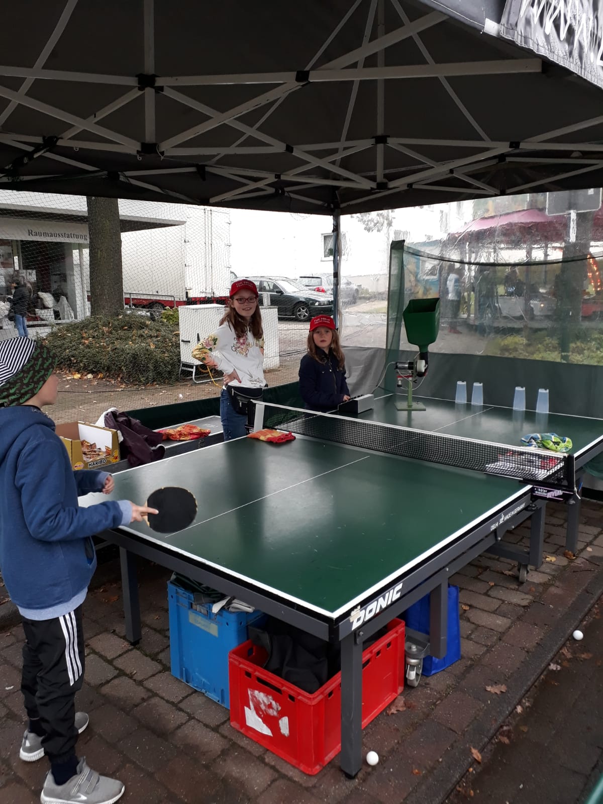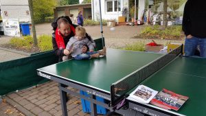 Glücklicherweise erfolgte der morgendliche Aufbau jeweils im trockenen und erst der Abbau am Sonntag war etwas naß, aufgrund der Nässe mussten wir diesmal auch immer mal zwischendurch Schläger, Bälle und Tisch mit Handtüchern abtrocknen. Erst dann konnte wieder gespielt werden. Zur Belohnung gab es wieder ein paar Tütchen Gummibären.